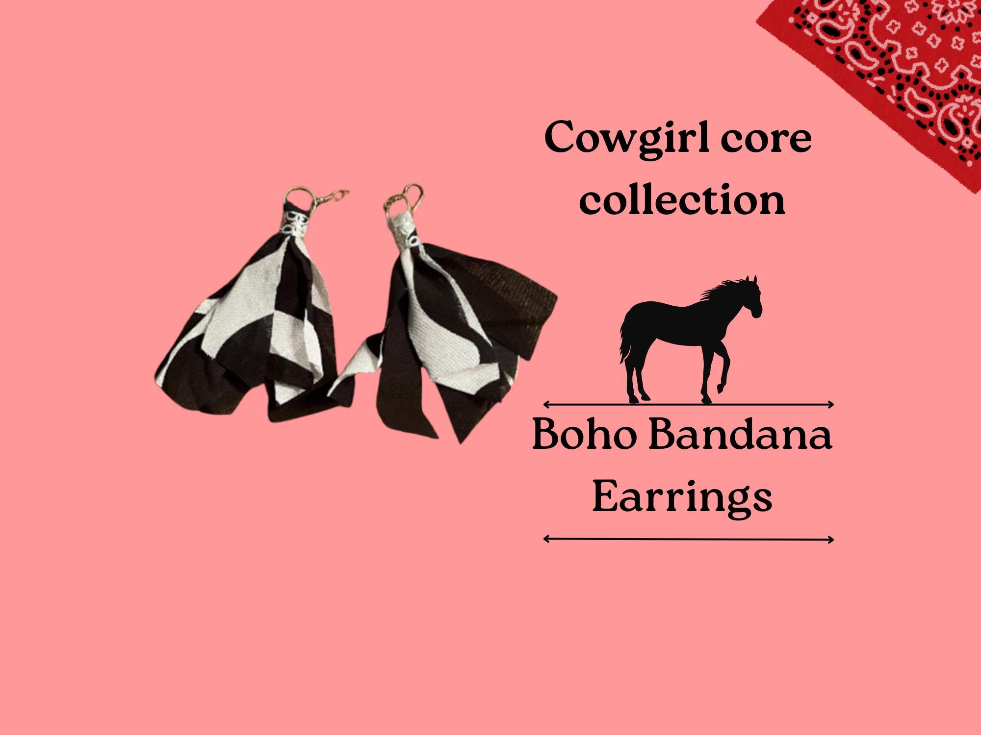 Boho Bandana Earrings, Western Cowgirl Style, Black White Tassel Jewelry