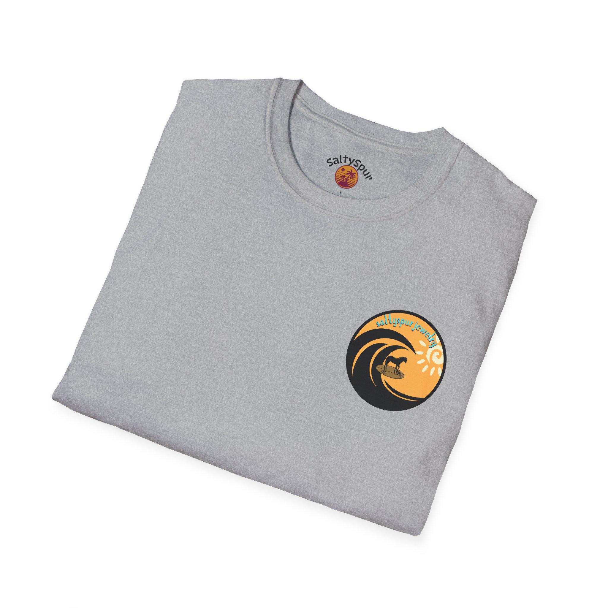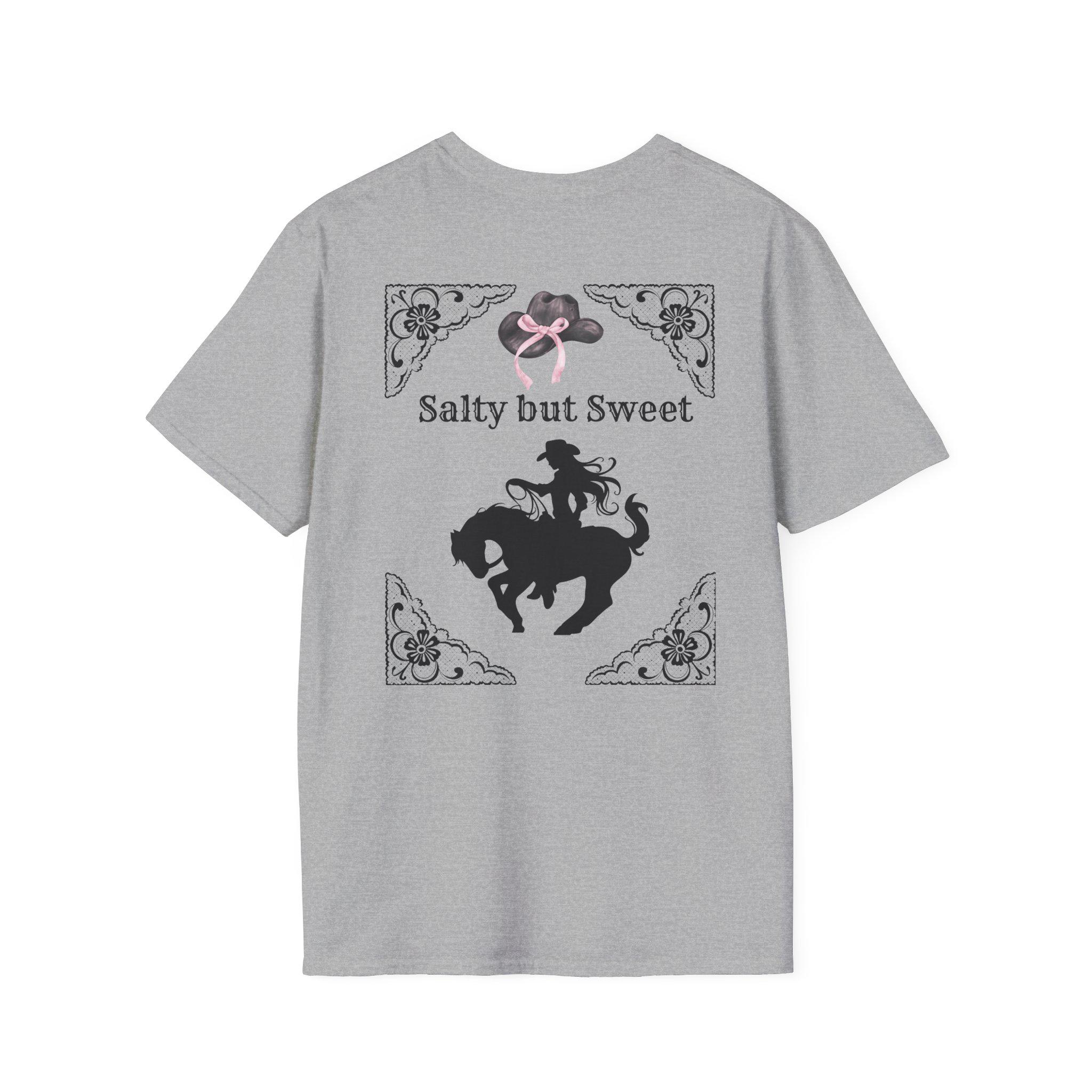 A soft, everyday tee that pairs sunlit surf vibes with a little country edge. The lightweight, ring-spun cotton feels gentle against skin while a small sunset-wave badge sits over the heart and a larger, vintage-inspired rodeo silhouette fills the back with the phrase “Salty but Sweet.” It reads like someone who spends mornings on the sand and evenings at the barn—laid-back, a touch playful, quietly confident. Wear it to slow dawn walks, bonfire nights, weekend rodeos, or whenever you want a shirt that hints at both ocean salt and prairie dust.