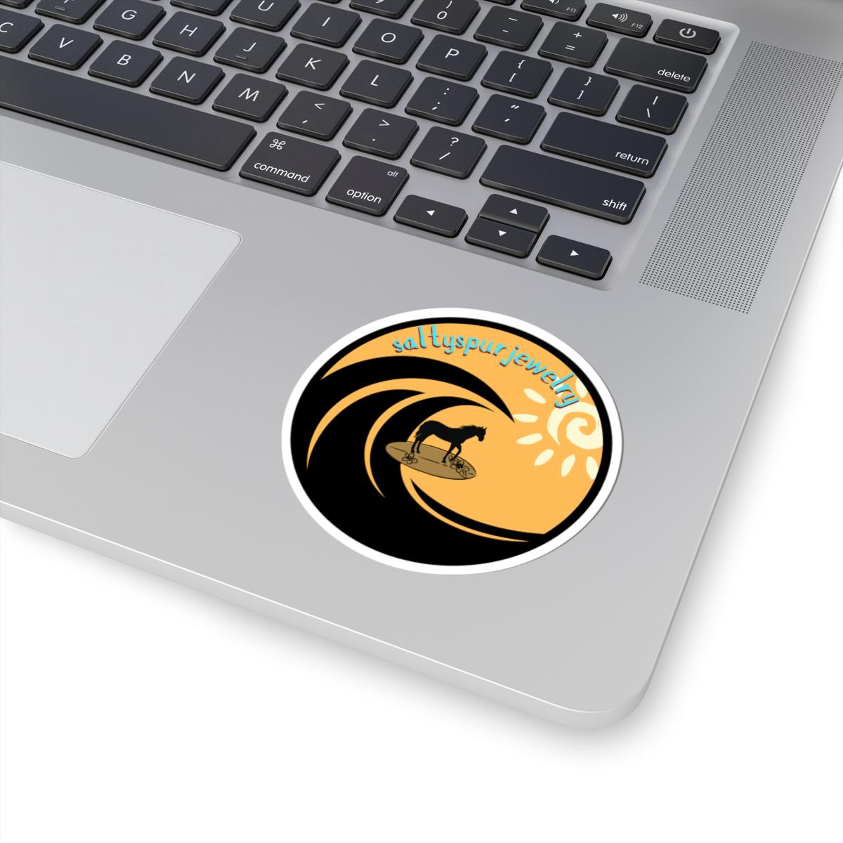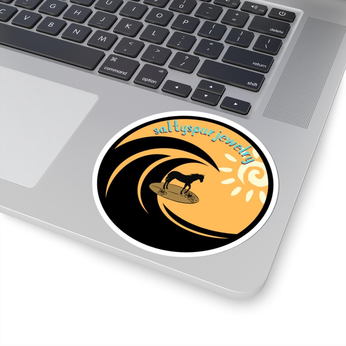 A glossy kiss-cut vinyl sticker that brings a sunny, coastal spirit to your gear. Warm golden tones curl into a stylized wave around a silhouetted horse standing on a small shoreline — a quiet nod to seaside rides and slow afternoons under the sun. The small sunburst and hand-lettered name add a handcrafted, beachside charm that pairs well with journals, laptops, water-bottle caps, or any smooth surface where you want a touch of equestrian-meets-coast personality.
