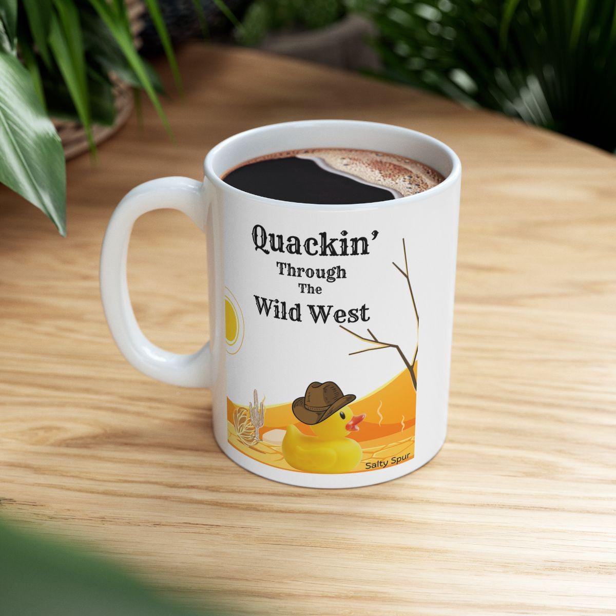 Quackin' Through the Wild West Coffee Mug | Ceramic Mug, Funny Mug, Coastal Cowgirl, Western. It is so much fun to gift this to your friends! Bring out the funny western side of you every morning with the fun-loving western duck! The comfortable C-handle and shiny finish make it easy to cradle; the vivid colors keep the artwork bright through daily use. Lead- and BPA-free, available in two sizes so you can choose a little extra comfort when you need it.