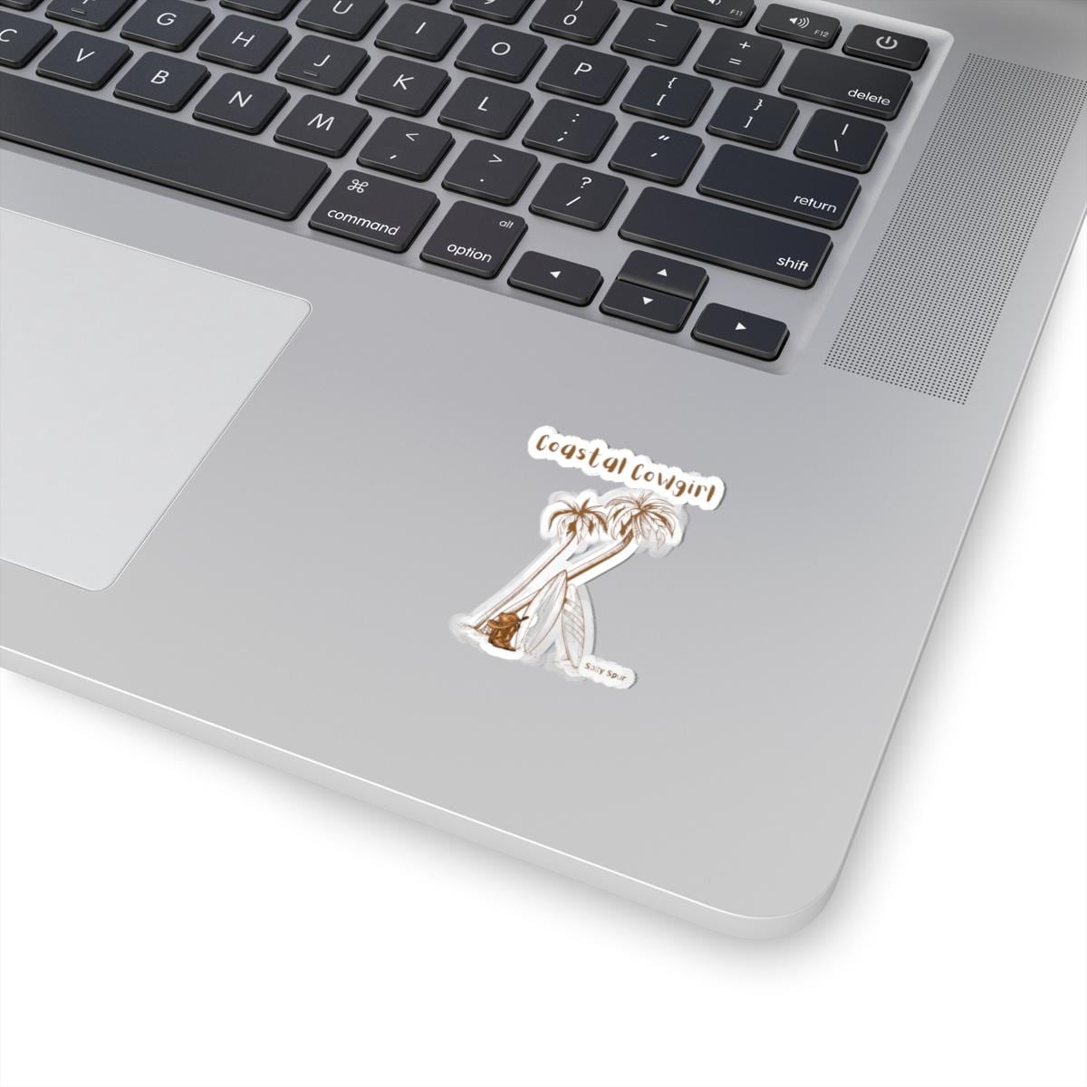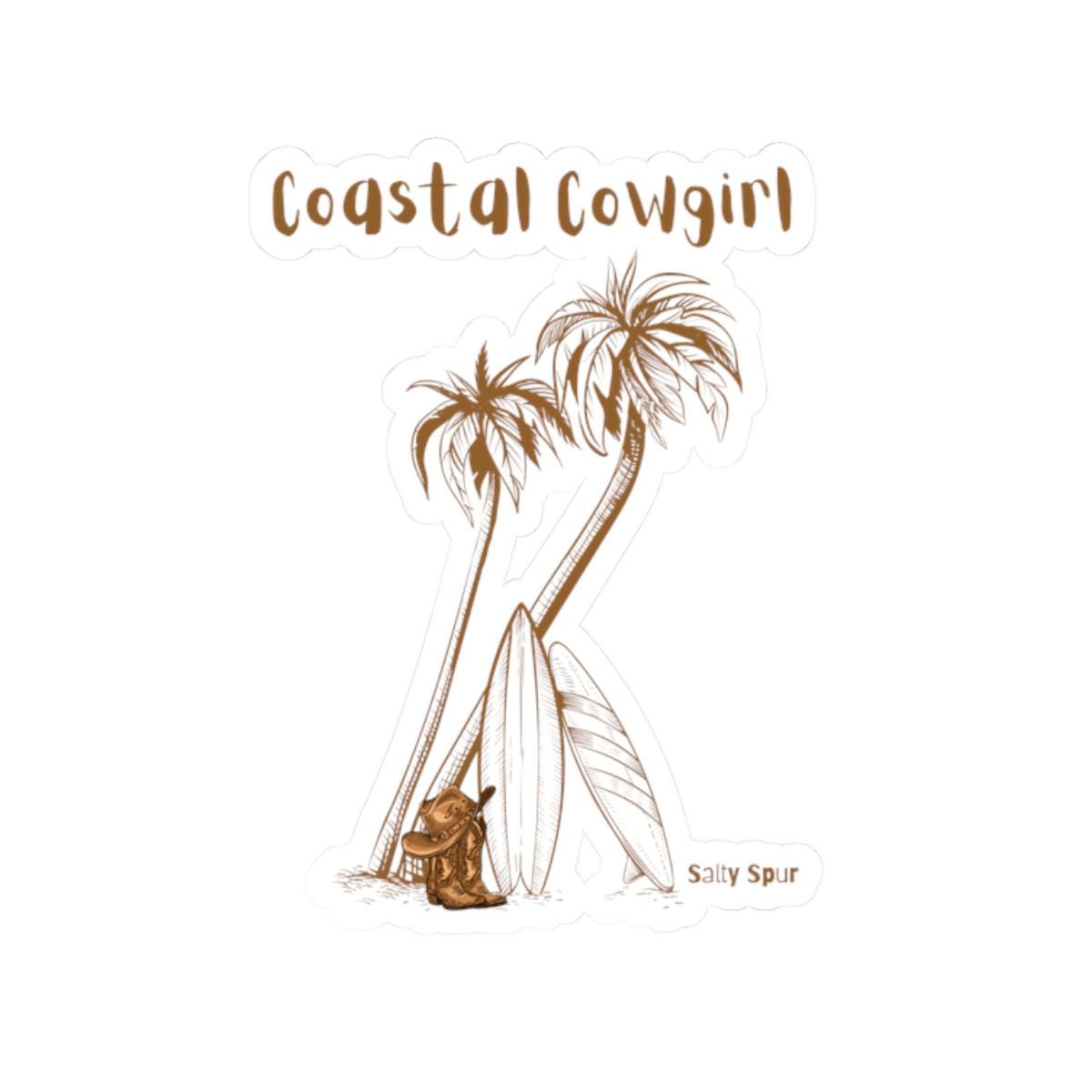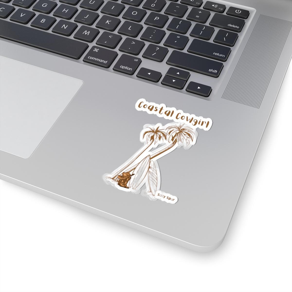 Soft, sun-warmed vibes in a little sticker. This glossy kiss-cut decal captures a laid-back coastal scene — lean surfboards, swaying palms, and a tiny, content cowgirl settled in the sand. It feels like the slow exhale after a morning paddle: salty air, sandy feet, and a quiet corner of shoreline that belongs only to you. Stick it on a laptop, journal, or window to carry that beachside calm into everyday moments and small adventures.