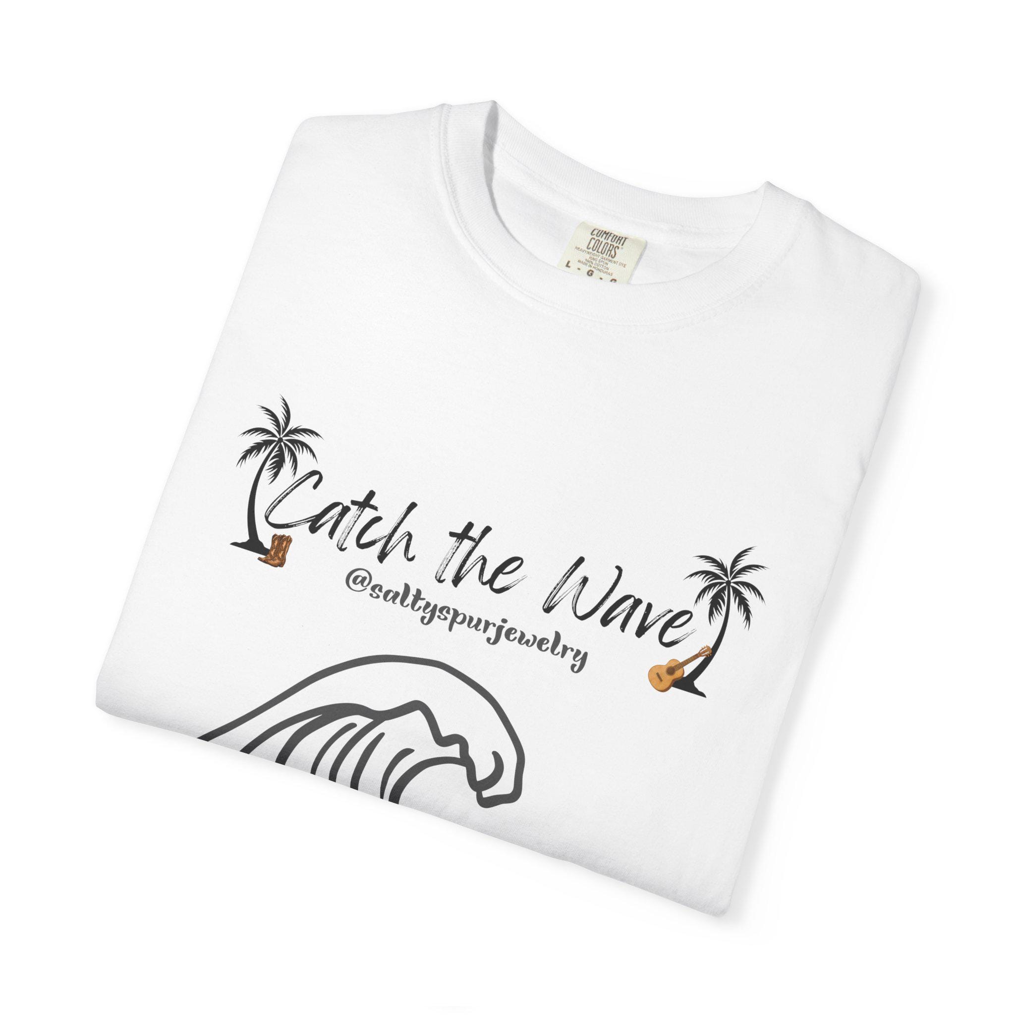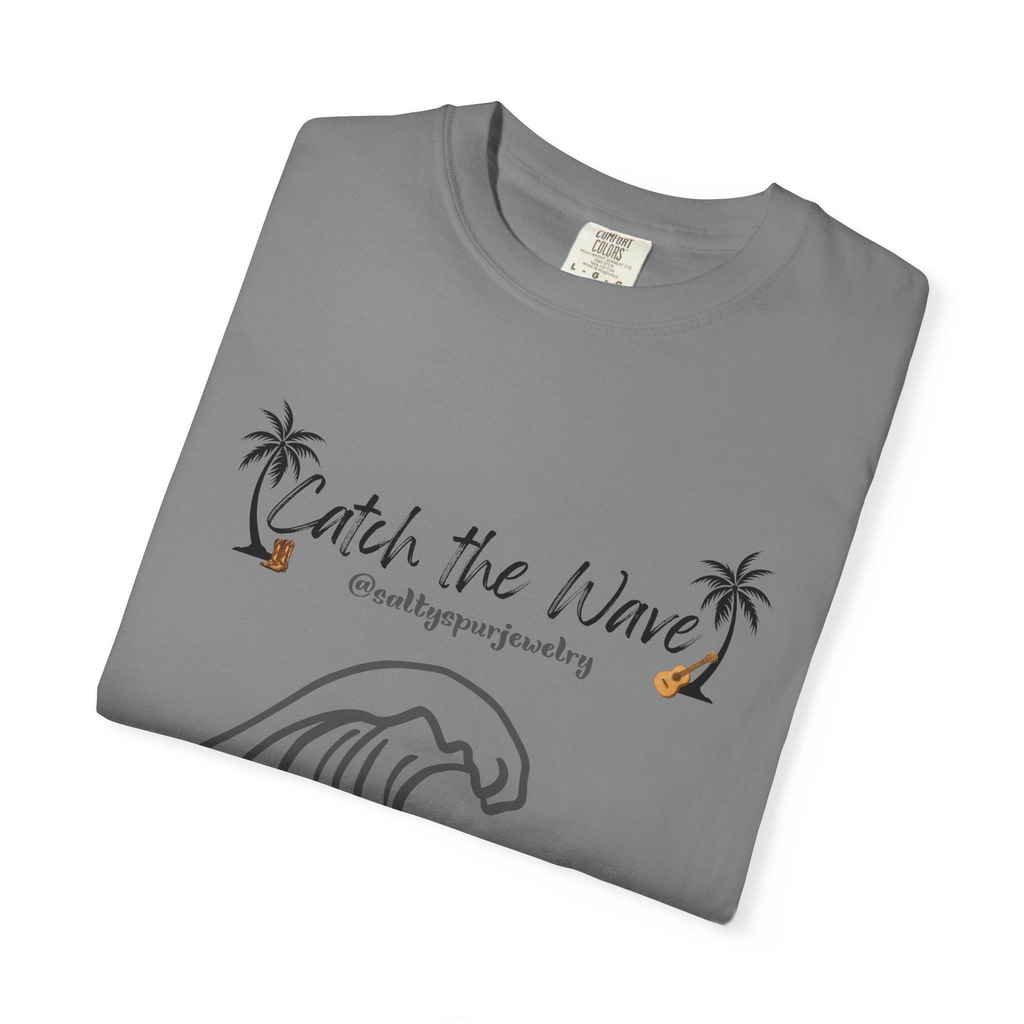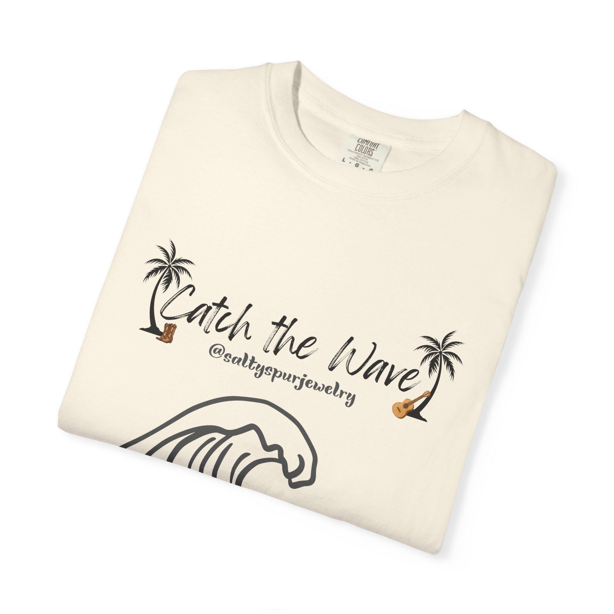 This garment-dyed tee carries a sunlit surf scene that feels like a morning on the coast. The soft, worn-in color and heavyweight cotton give it a lived-in comfort that invites long walks, spontaneous beach hangs, and slow coffee afterward. It drapes relaxed across the shoulders and breathes easily during hot afternoons. The circular graphic — wave, sun, and a small silhouette — sits like a souvenir from a day spent chasing waves, quiet and confident rather than loud. Wear it with cutoff shorts, a weathered denim jacket, or beneath an open shirt for evenings when the breeze cools down.
