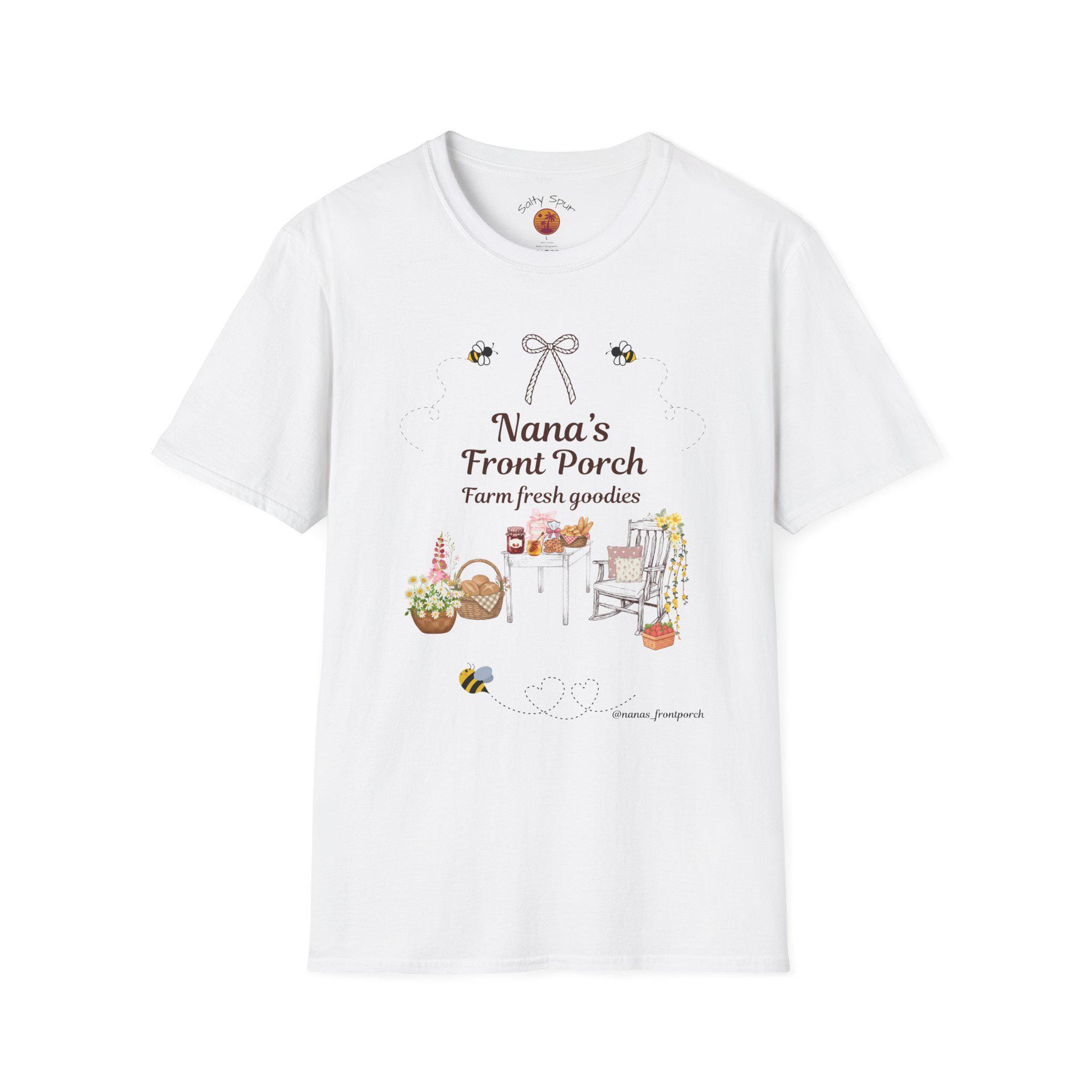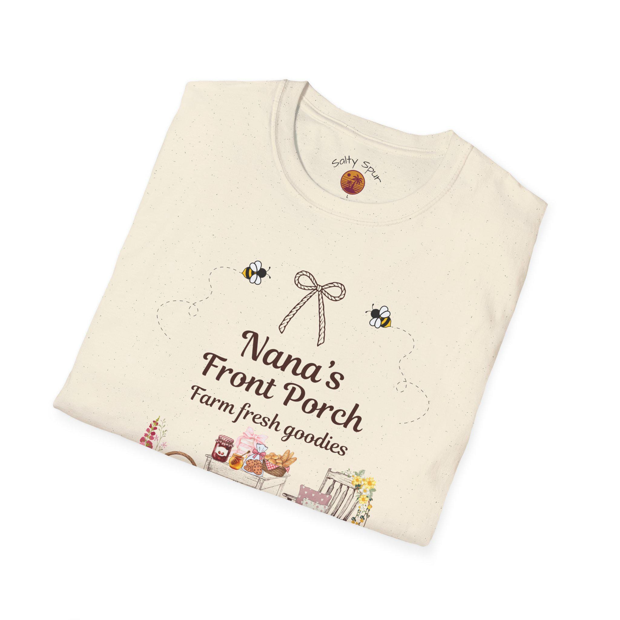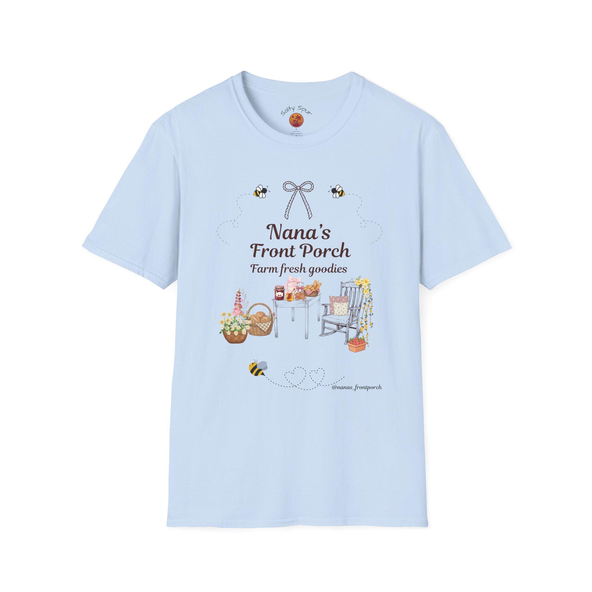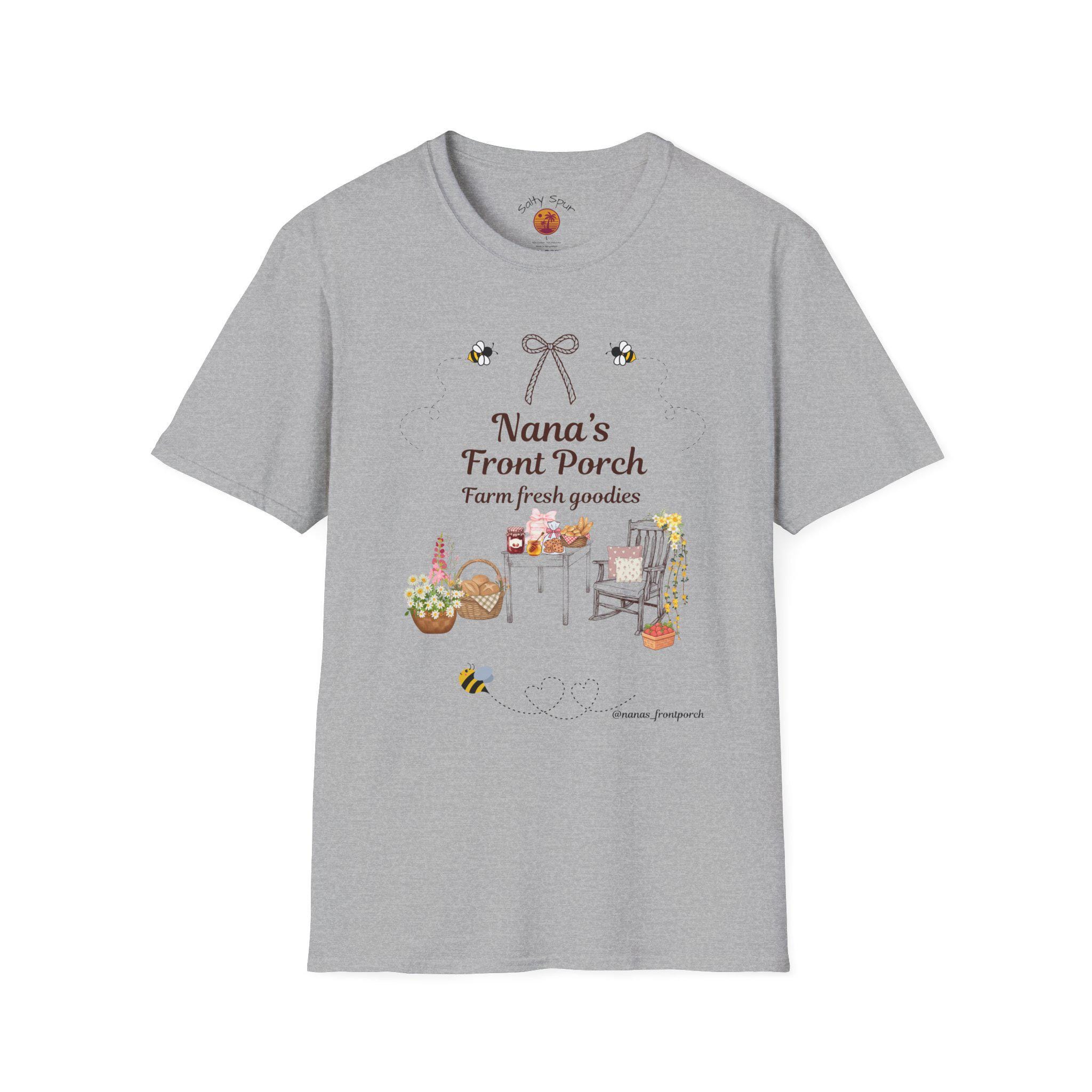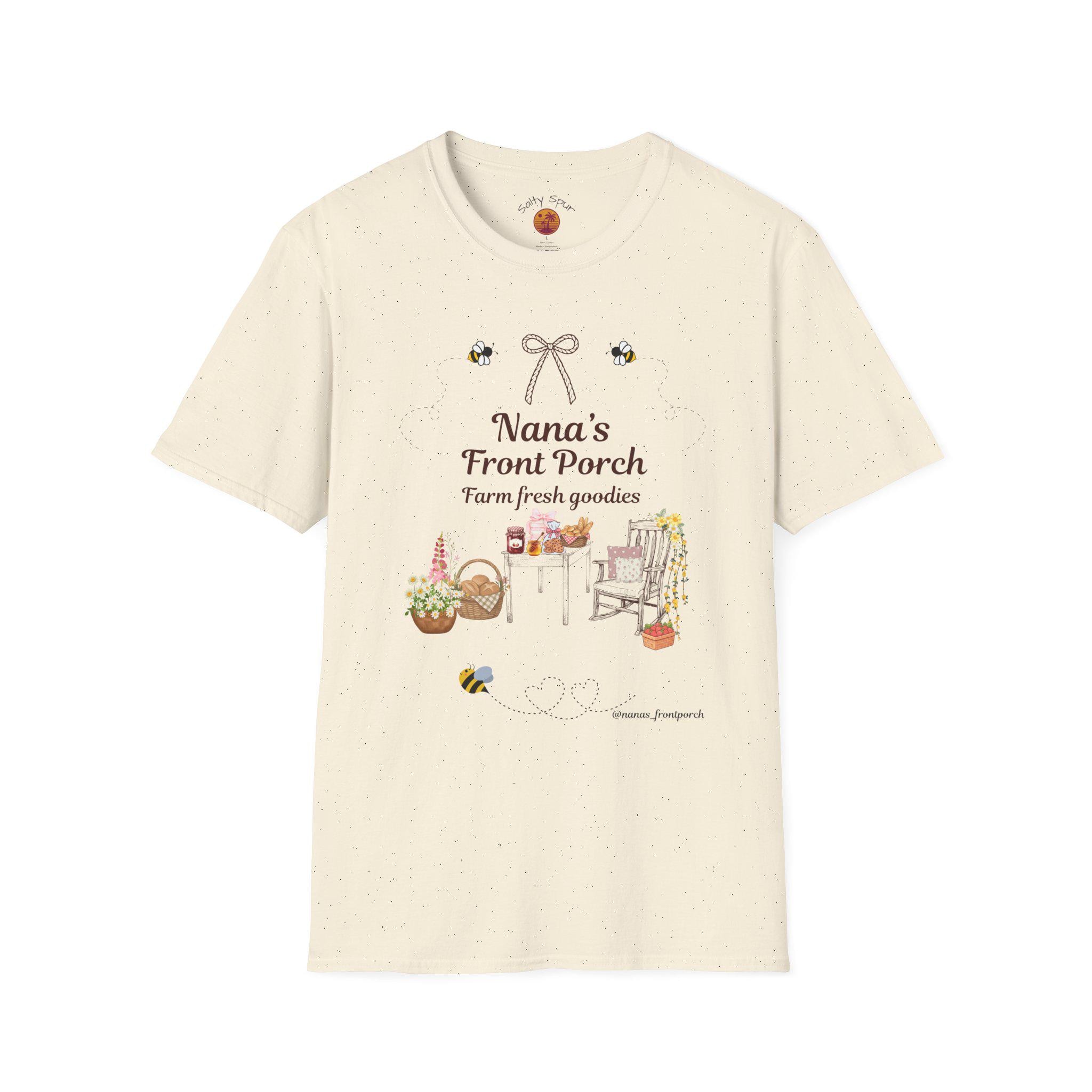 Soft, warm, and quietly nostalgic — this lightweight tee wears like a friendly hello from the porch. A hand-drawn scene of a rocking chair, harvest baskets and a little roadside stand reads “Nana’s Front Porch” above delicate bees and a tiny bow. It feels like late-summer sunlight, jars of preserves cooling on a table, and slow conversations that stretch into evening. Slip it on for morning coffee on the porch, errands in town, or laid-back family visits; it layers easily under a cardigan or pairs with worn jeans for an effortless, lived-in look.
