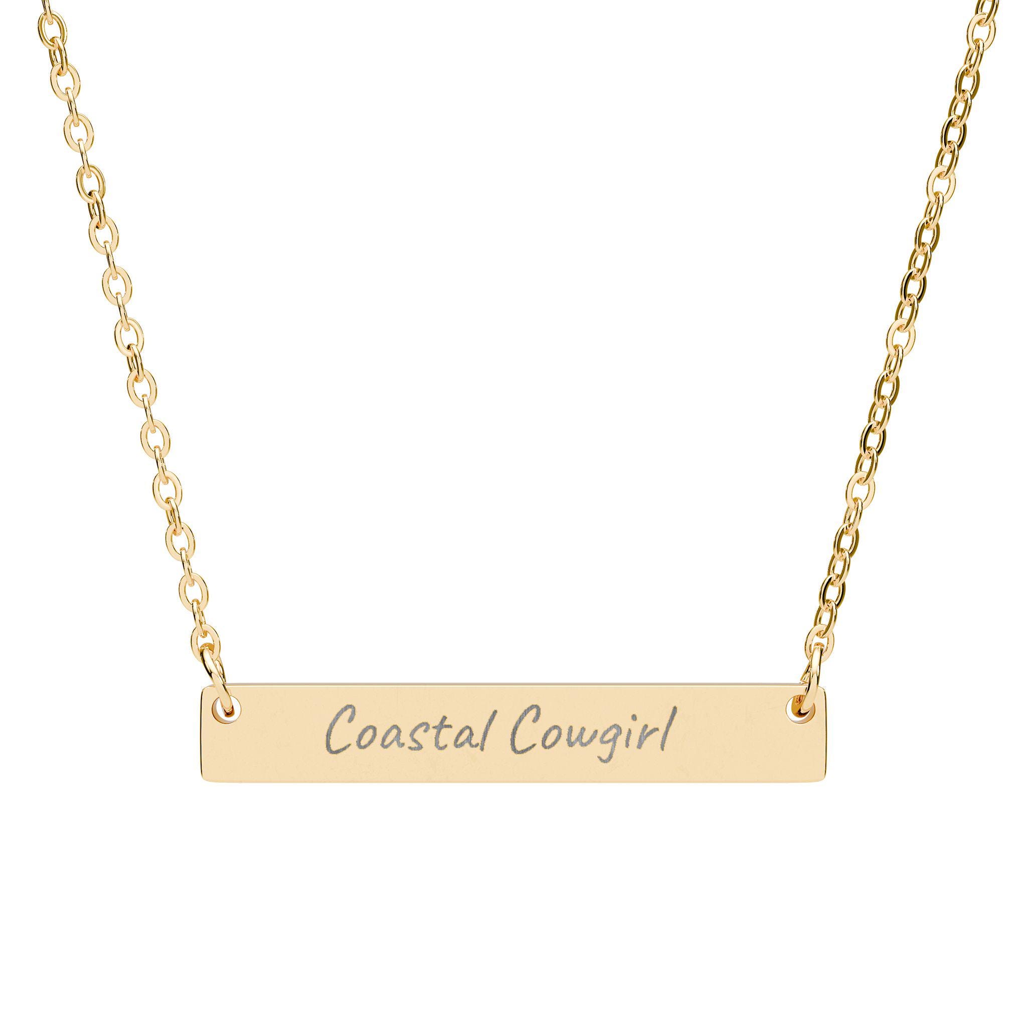 A low-profile horizontal bar necklace with clean laser-engraved lettering for a subtle, personal touch. The slim 32 x 5 mm bar hangs on a delicate chain and carries a crisp, permanent etching that won’t fade. Its surgical-grade stainless steel construction gives it a cool, polished look that layers easily with other pieces and stands up to daily wear. Lightweight and hypoallergenic, it sits just below the collarbone and reads like a quiet statement — a name, a short phrase, or a meaningful word meant to be kept close.