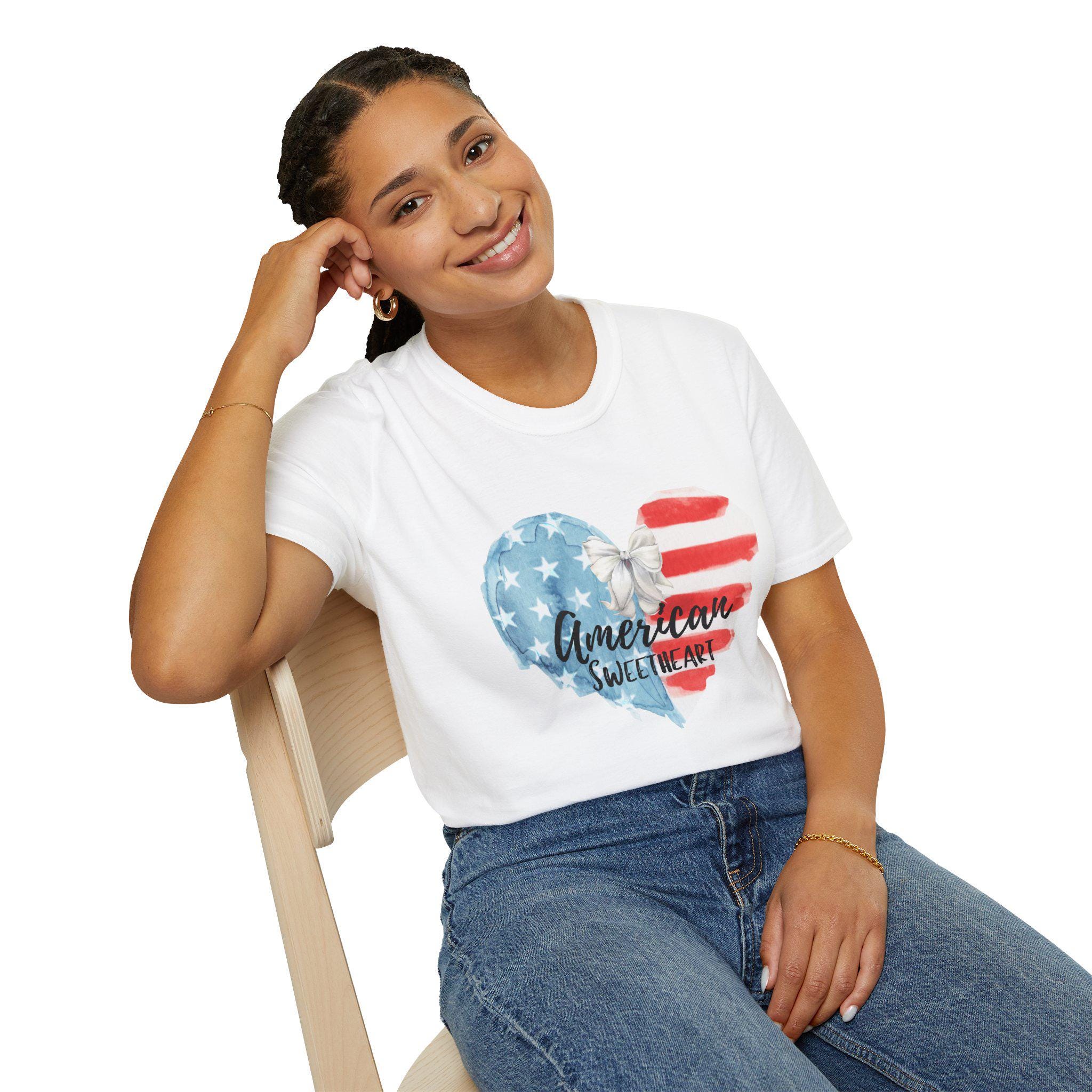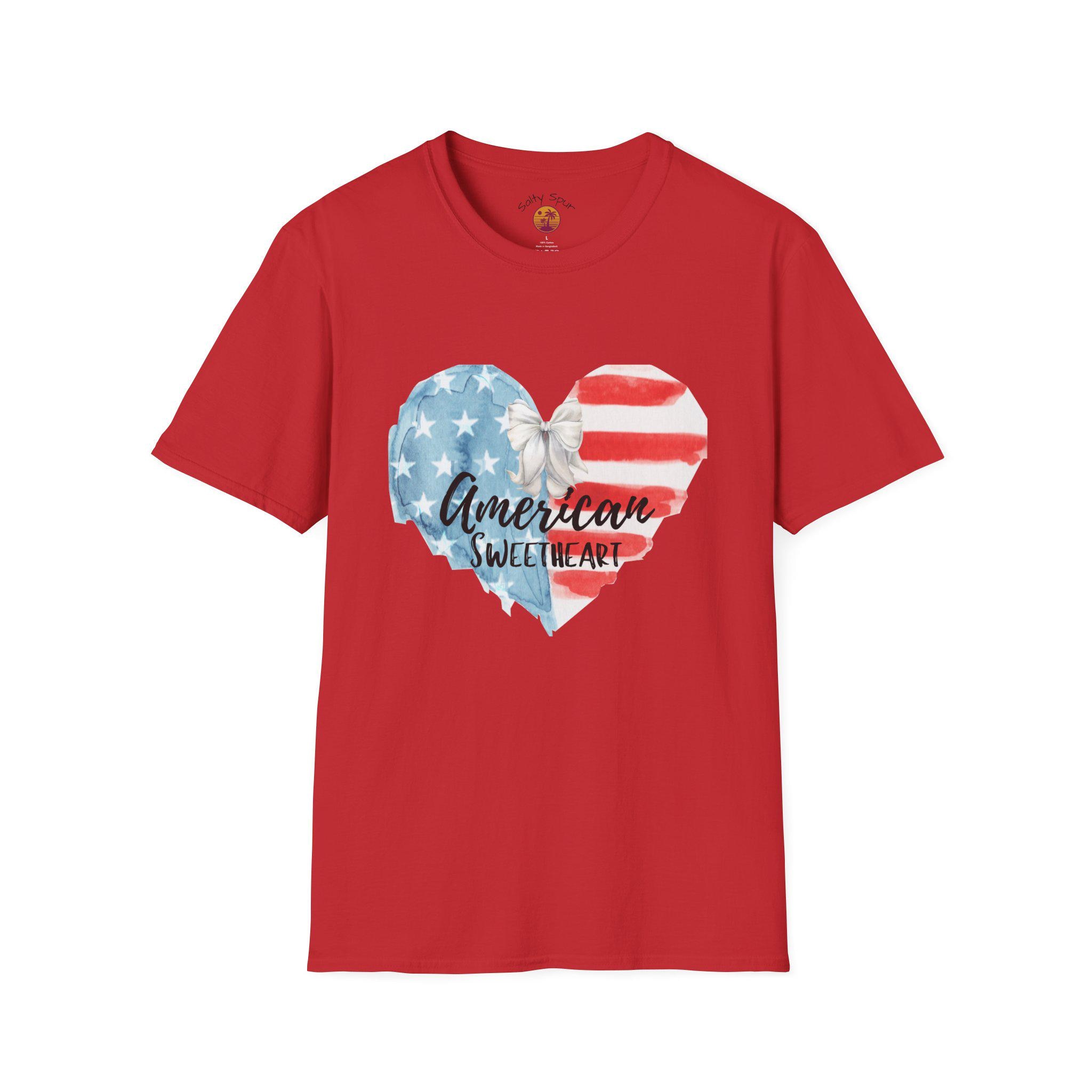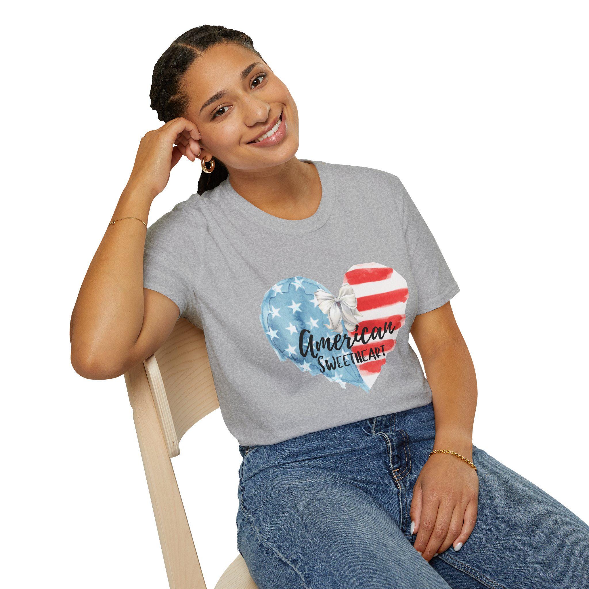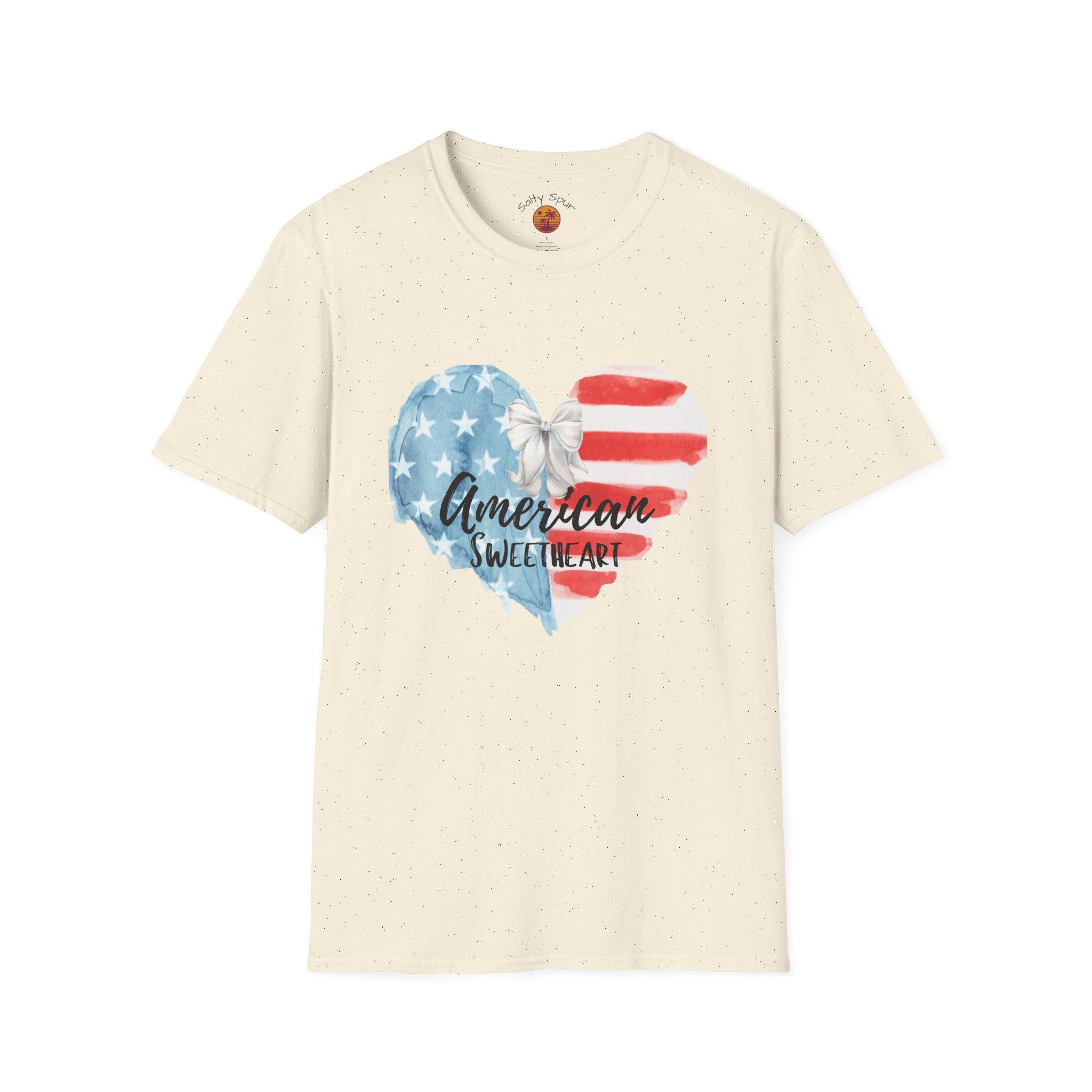This soft, lightweight tee wears like a lived-in favorite from the very first day. The front shows a hand-painted heart in faded stars-and-stripes hues with a casual script that reads “American sweetheart,” giving the shirt a warm, nostalgic vibe. It drapes cleanly thanks to a classic crew neckline and a straight, comfortable fit that layers easily under denim jackets or pairs with sun-warmed shorts. Breathable ring-spun cotton and tear-away label keep it comfortable through long summer parades, backyard barbecues, and slow evening drives. The subtle distressed look of the print reads like a personal memory—something you reach for when you want to feel familiar, proud, and a little bit sentimental.