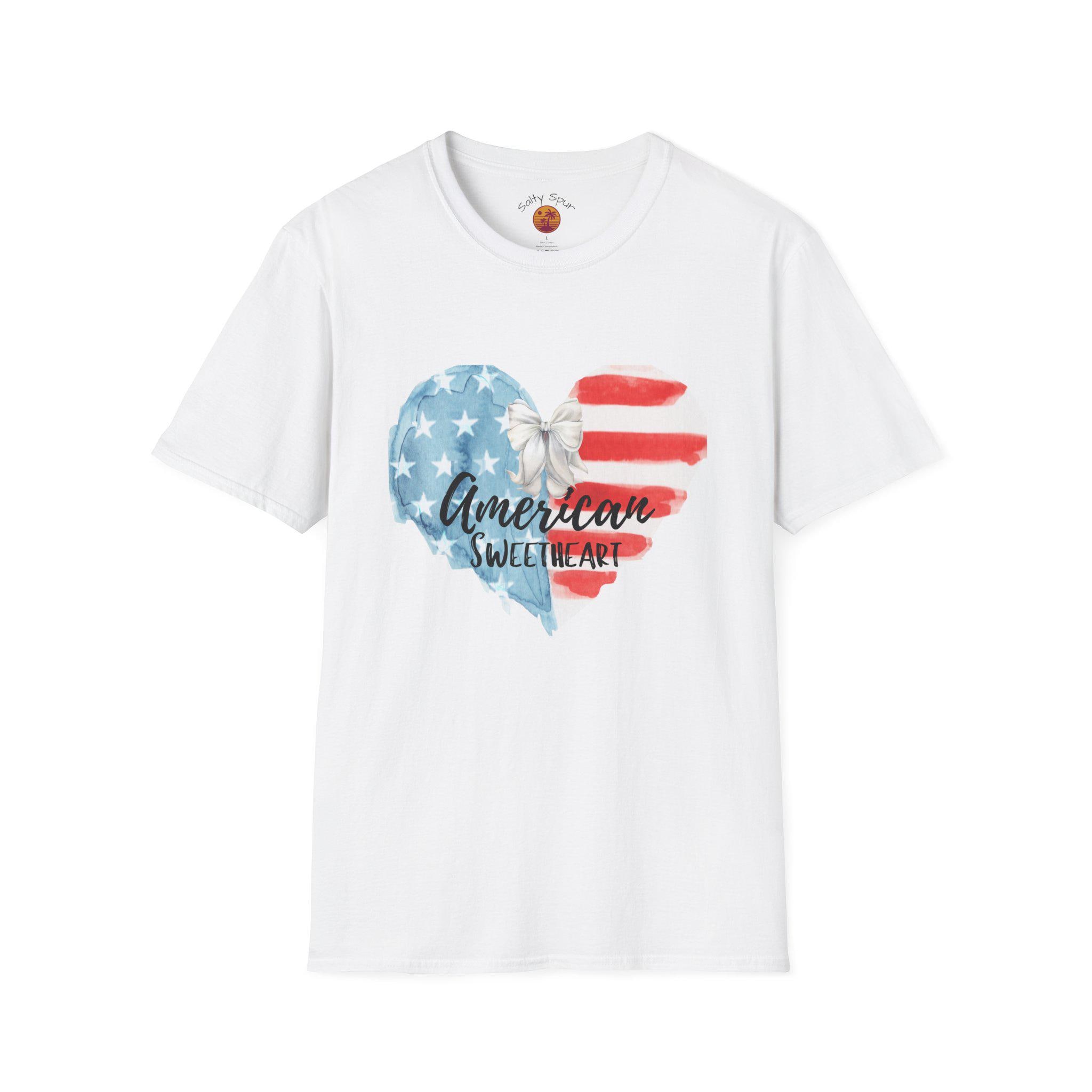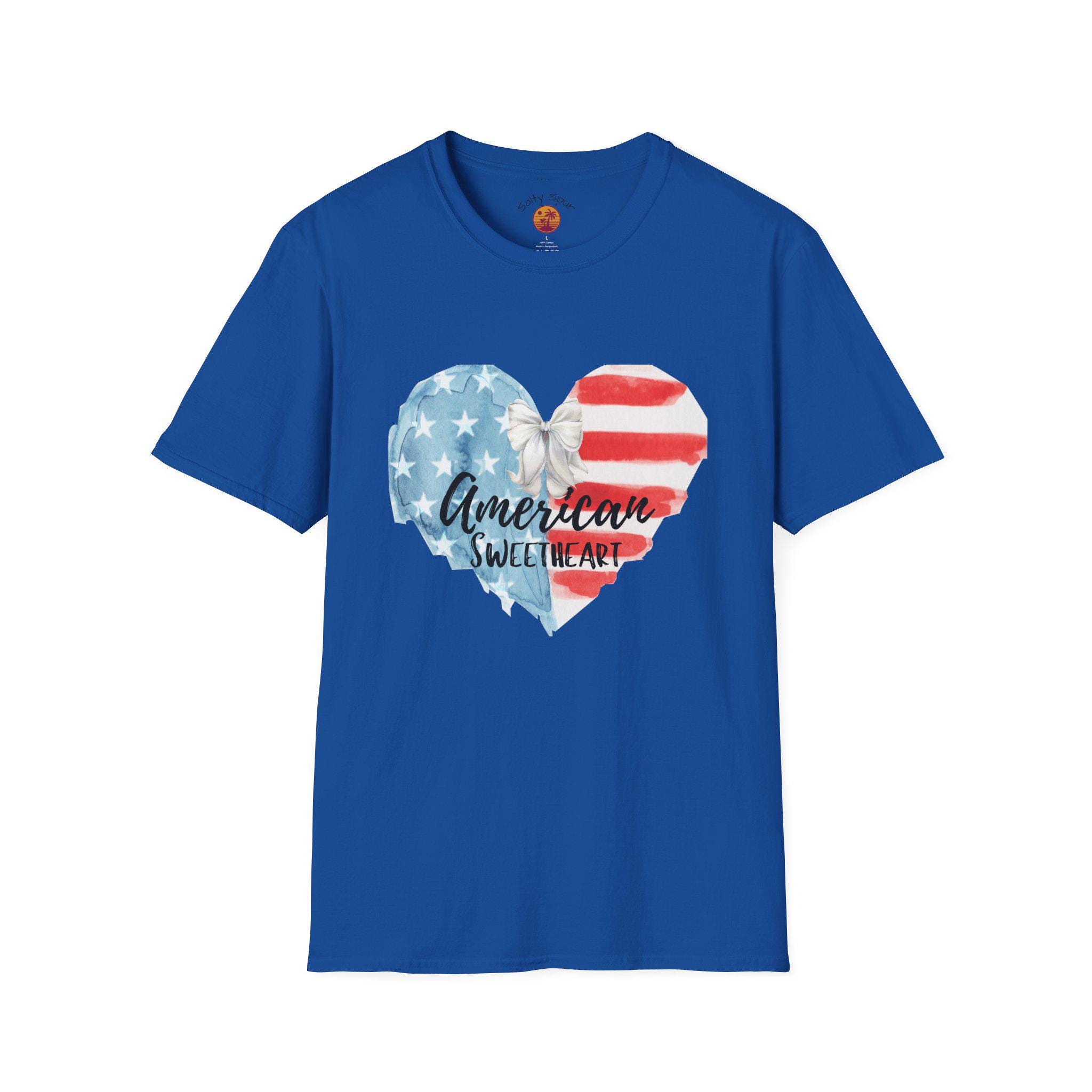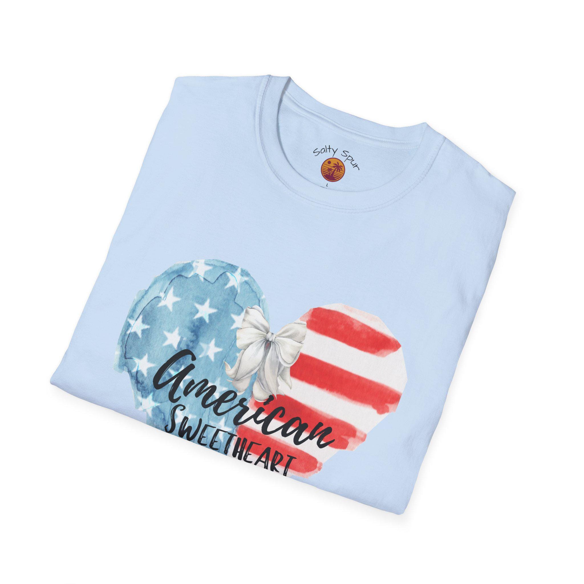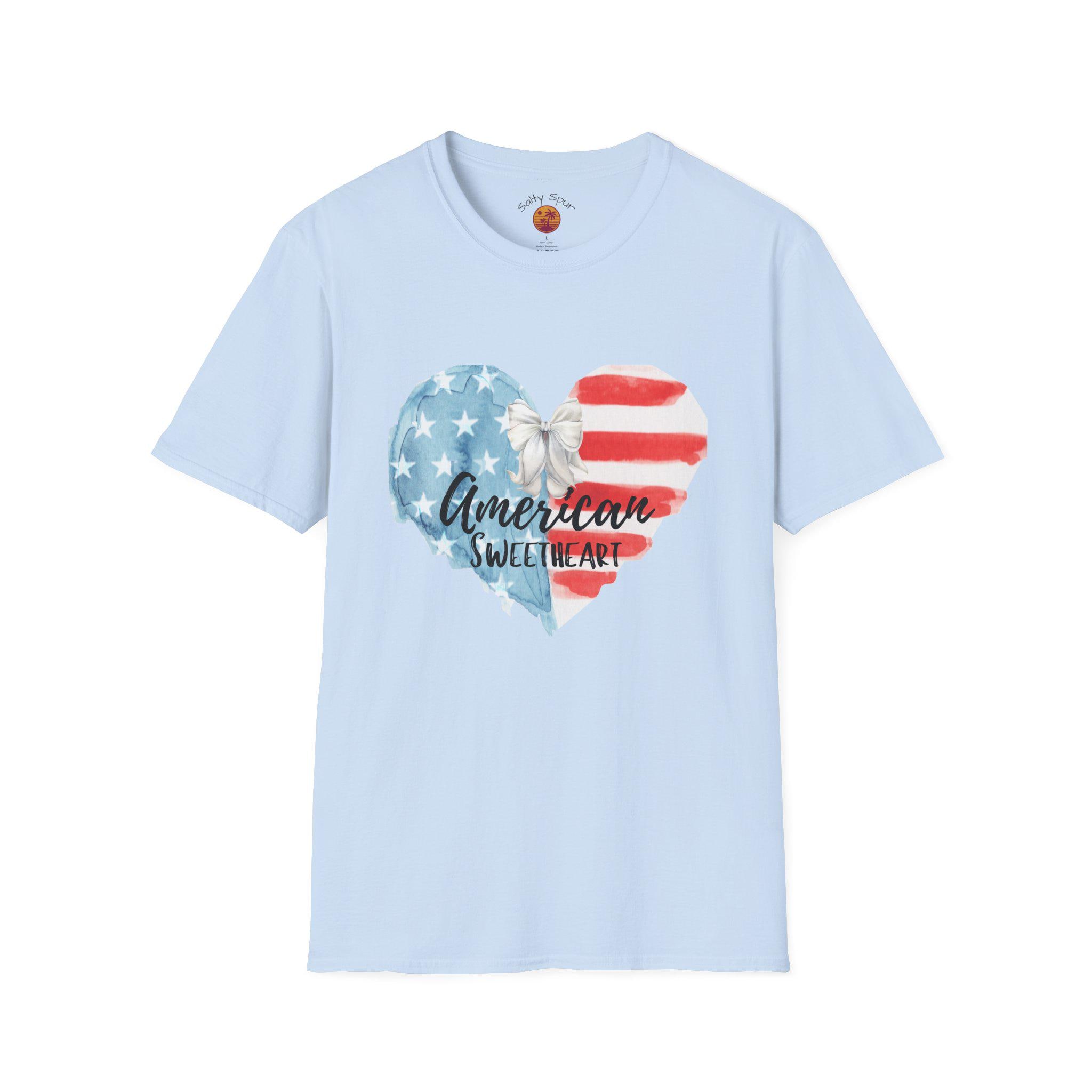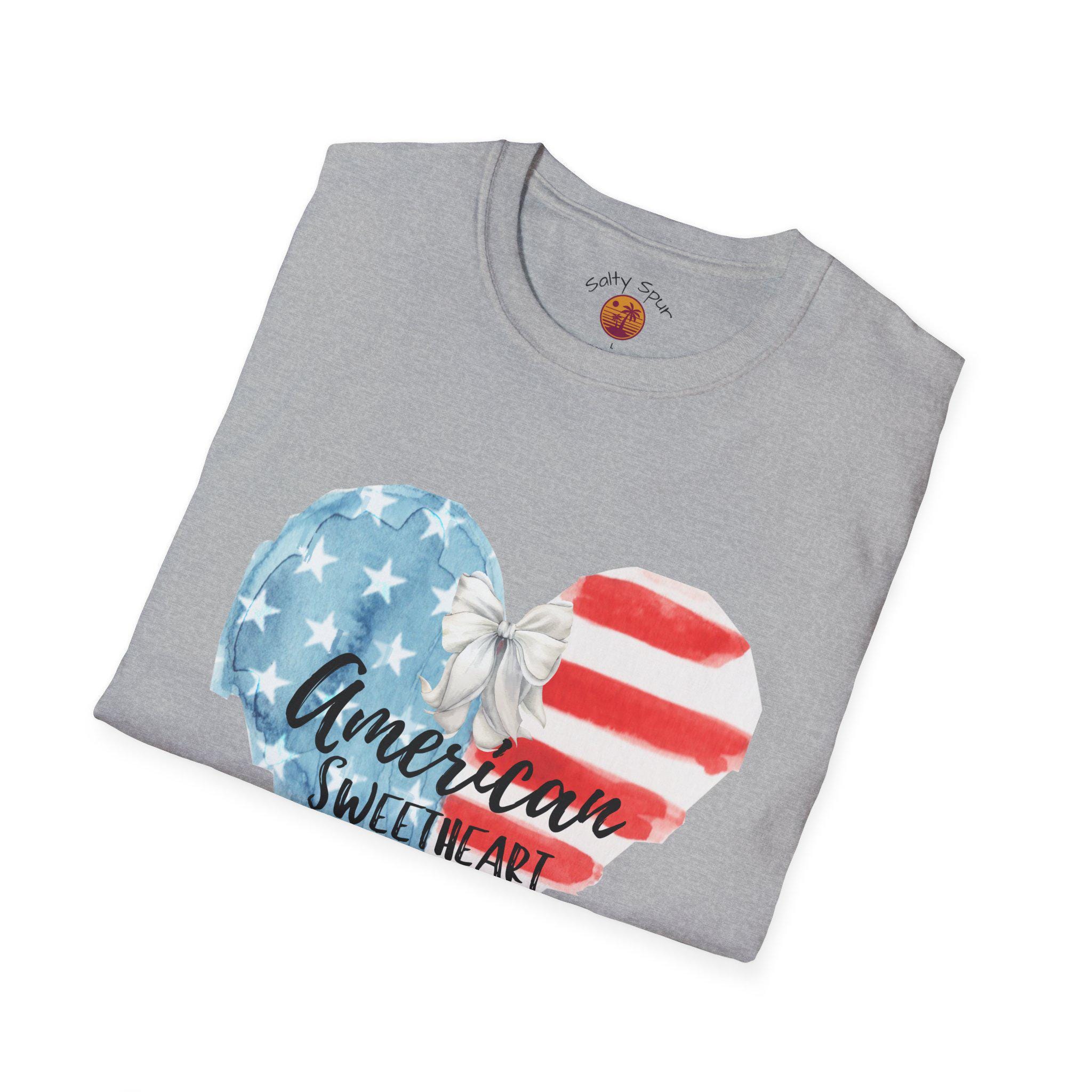 This soft, lightweight tee wears like a lived-in favorite from the very first day. The front shows a hand-painted heart in faded stars-and-stripes hues with a casual script that reads “American sweetheart,” giving the shirt a warm, nostalgic vibe. It drapes cleanly thanks to a classic crew neckline and a straight, comfortable fit that layers easily under denim jackets or pairs with sun-warmed shorts. Breathable ring-spun cotton and tear-away label keep it comfortable through long summer parades, backyard barbecues, and slow evening drives. The subtle distressed look of the print reads like a personal memory—something you reach for when you want to feel familiar, proud, and a little bit sentimental.